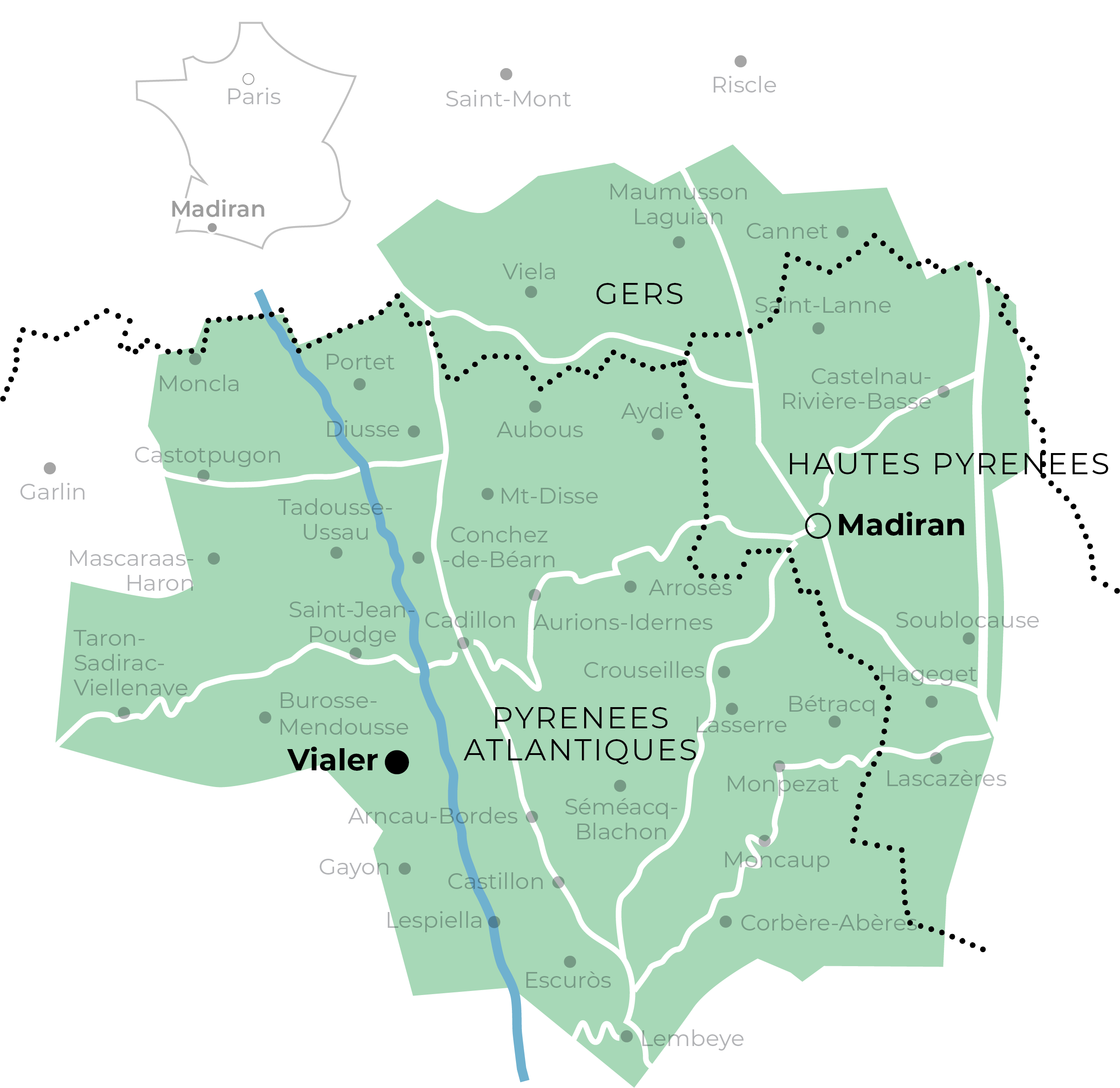 Cradled by the Pyrenean foothills, the Estate lies on the edge of the Madiran production area, which spans three departments: Gers, Hautes-Pyrénées and Pyrénées-Atlantiques. The wines have been specifically classified as ‘Vin de France’, granting the freedom to fully unlock the potential of this distinguished site, both in the vineyard and in the winery.